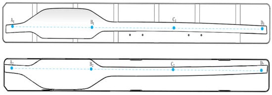 We performed a temperature simulation and analysis on the glass molds under four different heating rate strategies. As shown in Figure 6, observations were made at four points in the middle of the inner surface of the upper/lower mold, and the temperatures at points A, B, C, and D were compared under different strategies. The results of the simulation for the central temperature inside the glass mold are shown in Figure 7. As can be seen in Figure 7, the temperature of the glass mold also increased with the increase in the heating rate, and the temperature inside the mold increased from point A to D. Comparing the temperature changes of the two molds at 160 s, it is clear that the temperature difference of the upper mold was smaller than that of the lower mold. Taking points A1 and A2 as examples, the final temperatures of point A1 under the conditions of increasing the heating rate from low to high were 695.2 °C, 698.4 °C, 702.8 °C, and 706.3 °C, with a maximum temperature difference of 8 °C (in Figure 8). The final temperatures of point A2 at 160 s under the conditions of increasing the heating rate from low to high were 649.8 °C, 665.4 °C, 675.8 °C, and 677.2 °C, with a maximum temperature difference of 28 °C (in Figure 8). It is evident that the lower mold was more affected than the upper mold under the different heating rate strategies. This was due to the fact that the larger mold was heated, and the upper mold contained an additional heating tube than the lower mold, resulting in a more uniform finish.