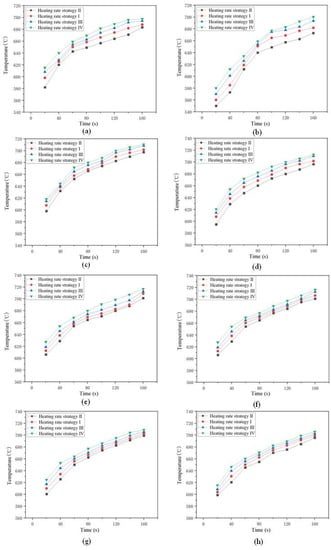 Simulation results of mold temperature under four different heating rate strategies. Upper and lower mold temperature measurement points: (a) A1; (b) A2; (c) B1; (d) B2; (e) C1; (f) C2; (g) D1; (h) D2.