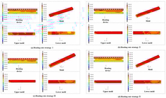 Figure 8 shows the temperature distribution in the final stage of heating (t = 160 s) using four different heating rates for the heating devices and molds. It can be observed that their temperature variation trends were also very similar. As the heating rate continued to increase, the maximum temperature of the heating equipment and mold also rose. Conversely, if a slower heating rate is used, the surface temperature will decrease as the heating plate and its transmission parts cool down. After comprehensive consideration, adopting heating strategy Ⅳ (45 mJ/(mm2·s)) can significantly shorten the processing time and effectively promote energy efficiency.