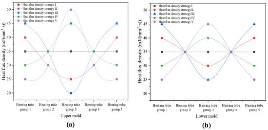 Schematic diagram of five different heat flux density strategies during the glass molding process; (a) upper mold heat flux density distribution strategies, (b) lower mold heat flux density distribution strategies.