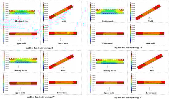 Five different heat flux density strategies were performed in simulation experiments, and the temperature at multiple observation points on the mold surface was observed. The simulation results of the different configurations of heat flux density in the final heating stage (t = 160 s) are shown in Figure 11. Based on the data in Figure 8 and Figure 11, whether using uniform or non-uniform heat flux density, the temperature variation in the heating equipment and the mold it produced was small. When using uniform heat flux density, the lowest temperature can be set to 718.5 °C, while when using non-uniform heat flux density (i.e., heat flux density strategy III), the lowest temperature can be set to 729.8 °C. When employing a strategy of higher heat flow density on the sides and lower heat flow density in the middle, the maximum temperature will be higher compared to using uniform heat flow density. Conversely, adopting the opposite approach will result in a lower temperature. However, the temperature distribution is similar to that of different strategies. Adopting the strategy can achieve balanced heat transfer but may reduce the temperature of the metal heating and conductive plates while increasing the mold temperature. Therefore, to improve production efficiency, a strategy with higher heat flow density on both sides and lower heat flow density in the middle can be chosen when selecting the heat flux density.
