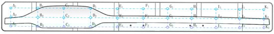 Schematic diagram of the selection of observation points for the lower mold temperature (A1–K3 are the temperature detection points).
