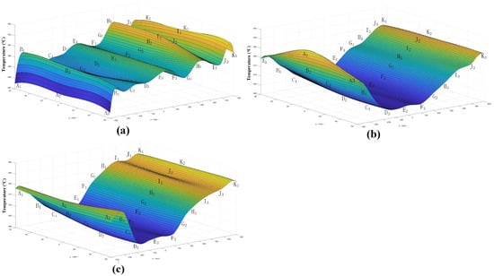 Temperature distribution on the inner surface of the mold under three different strategies of heat flux density; (a) heat flux density strategy I, (b) heat flux density strategy II, (c) heat flux density strategy III.