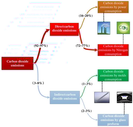 As a major contributor to the world economy, China is the world’s largest producer and consumer of coal and, naturally, the world’s largest emitter of carbon [25,26,27,28]. Therefore, improving the efficiency of energy use and reducing carbon emissions are necessary parts of our production and processing [29,30,31]. During the process of forming large-scale automotive instrument glass, the heating apparatus requires electrical energy, the main source of which is coal used for electricity generation. The nitrogen required to cool the system also consumes a lot of electrical energy, which has an overall negative impact on the environment. Figure 15 shows the percentage of CO2 emissions from the automotive glass molding process. In the whole process, direct CO2 emissions account for about 92–97%, and indirect CO2 emissions account for about 3–6%. In the heating process, heating the mold and manufacturing nitrogen are the main components of direct CO2 emissions, accounting for 18–20% and 74–77%, respectively. In addition, the service life of graphite molds is significantly shortened in high-temperature environments; therefore, both graphite molds and glass raw materials are consumables, and the indirect emissions of CO2 are mainly from the process of manufacturing graphite molds (1–3%) and glass raw materials (2–3%). It was found that the direct emissions of CO2 are more significant than their indirect emissions.
