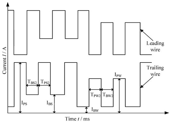 To date, research on the mechanism of twin wire welding mainly focuses on the interaction mechanism of twin arc and arc stability, metal transfer mechanism and the stability of twin wire welding [15,16]. Moinuddin et al. [17] found that the reversal phase of the leading and trailing arcs could be used to control the stability of the welding process. The current oscillograms of twin wire double pulsed welding are shown in Figure 1. As the current of the leading arc was greater than that of the trailing arc, the arc stability was better. Wu et al. [18] found that the twin-arc interference of the reversal phase was more serious by investigating the high-current twin-wire pulsed GMAW welding, while the interference behavior significantly reduced when the phases were identical. Ye et al. [19] found that when the trailing arc increased, the leading arc was significantly closer to the trailing arc due to the electromagnetic effect, and the globular transfer mode of the leading arc transited from globular transfer to rotation transfer. With respect to the welding speed, Ueyama et al. [20] found that to ensure good weld seam quality the maximum welding speed should vary between 2 and 3 m/min, which was about 60–150% higher than that of single wire pulse welding. Especially when using the push-angle layout, the welding speed could be increased to 3 m/min. As for the formation and microstructure of the welded seam, Wu et al. [21] found that the difference between the leading and trailing arcs impacted the microstructure, hardness, heat-affected zone, and depth–width ratio of the welded seam. Chen et al. [22] found that the horizontal component of the arc pressure drove fluid to the center of the two arcs, which resulted in the local bulging phenomenon. With the increase in phase difference, the bulged height and seam width gradually decreased when the penetration depth and residual height of the seam increased, thus worsening the appearance. Some researchers have performed a series of explorations on the welding speed of twin-wire GMAW welding. Ueyama et al. [23] analyzed the influencing factors for seam formation during high-speed welding and found that the current, inclination, and twin-wire spacing had significant effects. Starting from the basic requirements to avoid humping and undercut, the optimum process parameters for high-speed welding were obtained at a welding speed of 4.5 m/min. Ueyama et al. [24] studied the effects of twin-wire spacing and gas mixing ratio on the arc interruption and abnormal arc voltage during twin-wire GMAW welding, and reasonable ranges of wire spacing and gas mixing ratio were provided by controlling the arc length and pulse timing of the twin-wire GMAW welding. Ueyama [25] successfully minimized the arc interference and avoided arc interruption. They established a stable welding process control using arc length and confirmed that the stability control was not affected by the fluctuation in extension in wire length and feed speed. In the context of the welding of steel plates in the ship-building industry, Sterjovski et al. [26] proposed a method to reduce the generation of cracks and studied the formation mechanism of solidified cracks in twin-wire GMAW welding. Some researchers have carried out a series of explorations on different shielding gas. Zhang et al. [27] studied the microstructures and properties of DSS 2205 solid wire MIG welded samples prepared in different shielding gases, which were investigated for improving the weldability of the DSS 2205 welded joint, and the strength and corrosion resistance of welded joints were improved more obviously in a 98%Ar + 2%N2 mixed atmosphere. Wang et al. [28] studied mixed shielding gas; increasing nitrogen had little effect on the strength and toughness of the weld. Regardless of the shielding gas used, the base metal was the weakest part of the weld. Lu et al. [29] transformed the traditional TIG welding gun into a double-layer gas channel, with an inert gas protective electrode connected to the inner layer. The outer layer was filled with mixed gas to transition active components to the molten pool, which changed the heat transfer and convection mode of the molten pool and increased the depth of the molten pool.