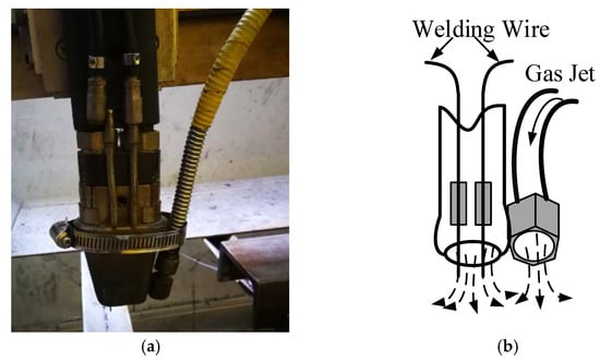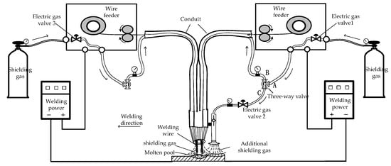 The schematic diagram of twin-wire pulsed GMAW welding under the action of additional shielding gas is described in Figure 2. The welding test platform included lead screws, wire feeding mechanisms, protection devices, automatic walking control mechanisms, data acquisition cards, and arc dynamic wavelet analyzers, which were used to collect real-time signals such as current and voltage, energy input, and dynamic resistance. The additional shielding gas device could better meet the protection requirements of the high-speed welding melt pool by adding three-way gas adjustable valves and adjusting the gas flow meters of branches B and C appropriately. At the same time, an additional electric gas valve 2 and a one-way valve were also installed, which could facilitate valve control. The shielding gas nozzle head also had a protective effect. These can be efficiently combined with existing welding equipment to better meet the requirements of gas flow regulation. The principle of this system is relatively simple. During operation, the gas source at the cylinder enters the electric air valve 1 of the gas supply branch, and then the valve is controlled by a button. During the working process, when welding begins, the gas valve is opened, and shielding gas can enter the corresponding conduit. The conduit and regulating valve A remain connected. The main function of the three-way gas adjustable valve is to regulate the gas from the main circuit and distribute it appropriately. In order to meet the requirements of B and C outlet gas flows and provide appropriate protection, the gas flow of branch C is outputted from C and then controlled to be on or off through gas valve 2. During this process, the airflow sprays from the nozzle cover the newly welded seam, which can provide efficient shielding gas for the weld seam in this area and improve welding quality. The detail of the additional nozzle head is described in Figure 3.