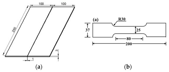 Butt welding with a gap of 1 mm was adopted, and is shown in Figure 4a. The additional shielding gas was argon (Ar) with a purity of 99.99%. Before the welding test, the sample was first mechanically polished to remove the oxides. The surfaces were cleaned with ethanol and the welding started after the surfaces were dried. After welding, a spark discharge wire cutter was used to remove 20 mm from both ends of the welded seam and the specimens for the tensile test and metallographic observation were taken along the direction vertical to the seam. The dimensions of the specimens are displayed in Figure 4b.