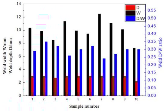 It can be seen from Figure 5 that the seam exhibited an overall uniform and flat morphology, which clearly manifested the improvement of additional shielding gas on the shaping process of the welded seam. In this paper, D is weld depth, W is weld width, and D/W is the ratio of weld depth and weld width. It can be seen from Figure 6 that under an identical welding speed and current the higher flowrate of the additional shielding gas produced a wider welding seam, deeper penetration depth, and smaller aspect ratio (depth/width). The appearance of the seam formed under the additional shielding gas changes and the specific dimensions of the seam is displayed in Figure 7. As the flowrate of the gas increased, the width of the seam increased gradually and the residual height gradually decreased, since the different flowrates of additional shielding gas brought variation in the impact force acting on the welded seams. When the flowrate of the additional shielding gas was 12 L/min, the impact force of the jet was more suitable for the set of welding parameters that best improved the welded seam. The shape of the obtained welds varied greatly and the morphologies of welds formed with an additional shielding gas flowrate of 12 L/min were obviously superior to those with shielding gas flowrates of 0 L/min, 8 L/min, and 16 L/min, and the surface of the weld seam was relatively smooth and uniform. The weld surface exhibited an obvious fish-scale-like weld seam. It can be concluded from Figure 7j that the part of the weld bead without additional shielding gas had an unevenly curved formation, and the weld was narrow and the penetration depth was insufficient, indicating the poor formation of the weld seam. The impact force generated by the gas under a flowrate of 8 L/min was slightly smaller and the improvement on the seam was not as good as that under the gas flowrate of 12 L/min. When the gas flowrate was 16 L/min, the over-protection phenomenon of the gas jet occurred on the welded seam. Under an excessively large flowrate of additional shielding gas, the seam had a grooved morphology with a lower middle part and higher sides, which indicates that the impact force of the jet exceeds the actual requirement of the liquid pool significantly [31]. The reason for the formation is that the molten pool becomes depressed under the excessive impact force acting on the molten pool. The liquid–solid phase transition was completed before the metal bulging on both sides recovered to the middle region, so the metal exhibited a grooved shape after the solidification was completed. At the same time, a small amount of drop-shaped metal particles dispersed on both sides of the seams in tests #7, #8, and #9. Due to the excessive gas jet, a portion of the liquid metal separated from the molten pool and splashed on the surface of the base material under a strong impact force, and then formed metal particles [32]. It can be seen from Figure 7j that Sample 10 had obvious incomplete fusion defects without the additional shielding gas.