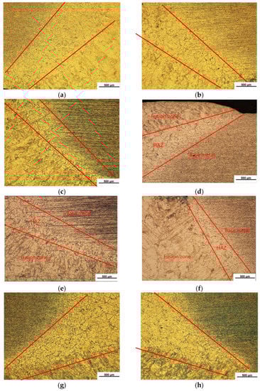 Then, the metallographic sample was mechanically polished and etched, by using aqua regia reagent to continuously corrode for 25 s, then flushed with water and dried with an air blower. The microstructure characteristics of welded joints were analyzed using optical microscopy Olympus (OM, Ishikawa, Japan) and scanning electron microscopy (Hitachi, Tokyo, Japan). A Vickers micro-hardness test was conducted on the polished and etched specimens with a testing time of 15 s per test point, a load of 200 g, and a step size of 1 mm. A room temperature tensile test was carried out on an INSTRON tester (INSTRON, Norwood, MA, USA), and the tensile tests of the joints were carried out following ASTM E8 at a crosshead speed 3 mm/min, and 3 specimens were tested for each welded joint. After the tensile test, the fracture morphology of the welded joint was observed using SEM according to the standard GB/T30834-2014.