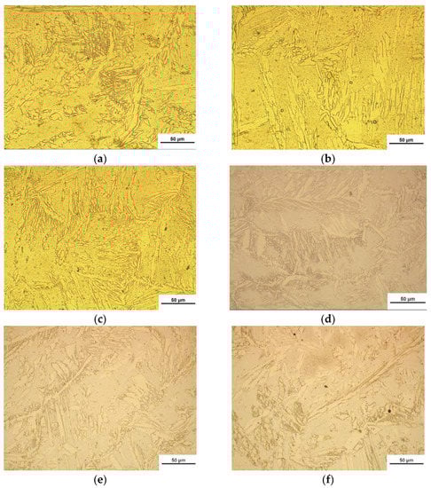 The microstructure of the seam was observed with 50× magnification. The welded seam showed obvious dendritic structures, most of which were austenite. These austenite structures were feathery and amounted to a relatively higher proportion. Most austenite became distributed in the grain boundaries and ferrite grains. It can be seen from Figure 9 that there were more Wei’s body structures in the welded seam, and the brittleness of the metal in the molten pool also increased significantly. Experimental results suggested that the grains of the fusion zones in tests #1, #2, and #3 were obviously coarser than those in tests #4, #5, and #6. The grains of the fusion zones in tests #7, #8, and #9 were coarser than those in tests #4, #5, and #6. Because the flowrates of the additional shielding gas in tests #1, #3, and #5 were smaller, so the flowability of metal was poorer and the residence time of liquid metal was longer. This could increase the proportion of austenite in the fusion zone and increase the brittleness of the metal in the molten pool, resulting in the hardness and toughness of the material in tests #1, #2, and #3 being worse than those in tests #4, #5, and #6. When the welding speed increased, the grain size of the fusion zone also increased to a certain extent. The reason is that when the welding line energy increased, the corresponding weld cooling rate reduced and the secondary dendrite spacing obviously increased, which easily formed a coarser structure. Moreover, under the influence of heat input, the metal of the welded seam would be in a high-temperature state for a long time, and the quantity of heat transferred under the action of the temperature also increased. This could promote the migration of the grain boundary [33]. The grain size in the weld fusion zone in #10 was obviously coarser and larger than that of the #5, as shown in Figure 5i,j. Due to the lack of additional shielding gas, the metal had poorer fluidity and the liquid metal had a longer residence time. As a result, the austenite in the fusion zone continued to increase, which led to the brittleness of the weld pool metal.