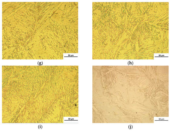 Metallographic test results of heat-affected zone (HAZ): (a) metallographic image of HAZ in test #1, (b) metallographic image of HAZ in test #2, (c) metallographic image of HAZ in test #3, (d) metallographic image of HAZ in test #4, (e) metallographic image of HAZ in test #5, (f) metallographic image of HAZ in test #6, (g) metallographic image of HAZ in test #7, (h) metallographic image of HAZ in test #8, (i) metallographic image of HAZ in test #9, (j) metallographic image of HAZ in test #10.