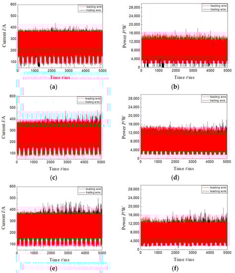 Welding current and power oscillograms: (a) welding current oscillograms with flow rates of 8 L/min, (b) welding power oscillograms with flow rates of 8 L/min, (c) welding current oscillograms with flow rates of 12 L/min, (d) welding power oscillograms with flow rates of 12 L/min, (e) welding current oscillograms with flow rates of 16 L/min, (f) and welding power oscillograms with flow rates of 16 L/min.