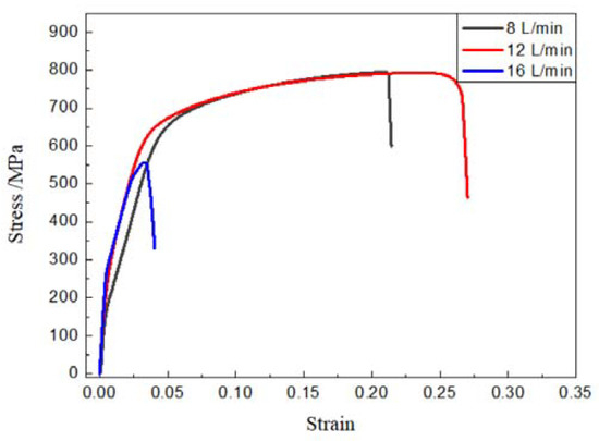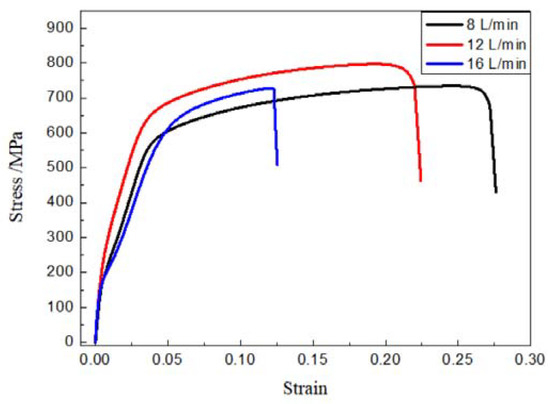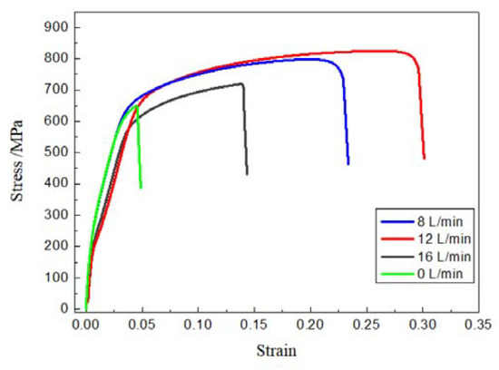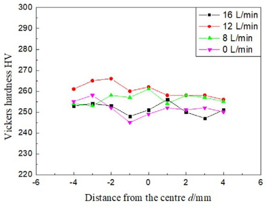 The results of the Vickers hardness test for the seam under additional shielding gas with different flowrates are shown in Figure 11. It can be observed that the Vickers hardness of the heat-affected zone metal was higher than that of base metal and weld metal, and the hardness of the weld metal was higher than that of base metal. The reason may be that the grain distribution in the heat-affected zone was not uniform, and it was easy to form welding residual stress in the welding process, resulting in the increase in hardness. It can be seen that the Vickers hardness of the seam formed under the flowrate of 12 L/min was slightly higher than that under the flowrate of 8 L/min, which indicates that an increase in the flowrate of the additional shielding gas was advantageous in increasing the hardness of the joints. This phenomenon occurs because the higher flowrate of the additional shielding gas increased the temperature gradient of the joints and accelerated heat dissipation, thereby endowing the joints with a higher hardness. The Vickers hardness of the welded seam under the additional shielding gas flowrate of 12 L/min was slightly higher than that under the flowrate of 16 L/min. This was because the excessive flowrate made the molten pool depressed under the impact force and the metal flowed downward obviously. The hardness of the weld without the additional shielding gas was generally lower than that under the additional shielding gas, which indicates that the introduction of the additional shielding gas was beneficial for enhancing the hardness of the joint. The phenomenon may have been due to the introduction of additional shielding gas increasing the temperature gradient of the joints and accelerating the heat dissipation at the joints. Due to the obvious bulging phenomenon of the metal flowing downward, it is difficult for the portion of the metal to transfer heat to the additional shielding gas. The slower heat dissipation of metal resulted in the coarse seam structure and then led to the lower hardness of the joint.