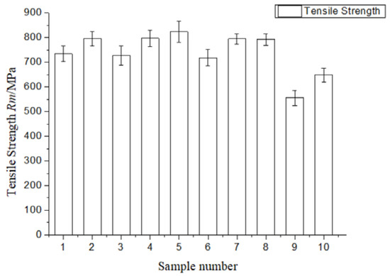 The tensile strength and fracture situations of the seams are shown in Table 3. The analysis of the test results in Table 3 indicated that the fracture positions in tests #1, #2, #4, #5, and #8 all appeared on the side of the base metal, and the tensile strengths of the welded seams were higher than those of the base metal. The fracture positions in tests #3, #6, #7, #9 and #10 appeared at the welded seams, indicating that the strengths of the welded seams were lower than that of the base metal. On considering the fracture positions of the welded seam simultaneously, the analysis indicated that the tensile strength of the welded seam was mainly affected by the cross-section shape of the seam. The seam with lower penetration could not withstand the high ultimate load, and so the fracture probabilities were also higher. However, the problem did not occur in the tensile test of the seam with better fusion.
