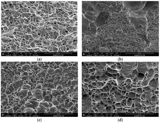 The tensile test results of the joints are shown in Figure 12, Figure 13, Figure 14 and Figure 15. The maximum tensile strengths of specimens #1~#10 were 734.21 MPa, 796.7 MPa, 728.47 MPa, 797.65 MPa, 824.3 MPa, 718.76 MPa, 793.05 MPa, 795.04 MPa, 555.84 MPa, and 649.05 MPa, respectively. This was under the identical welding current and for welding speeds of 160 cm/min, 180 cm/min, and 200 cm/min, respectively. The joint formed under the flowrate of 12 L/min had the highest tensile strength among the test specimens under different flowrates of 8 L/min, 12 L/min, 16 L/min, and 0 L/min. The morphologies of the tensile-fractured sections are shown in Figure 16 for when the welding speed was 180 cm/min. The fracture section of the weld seam formed under the flowrate of 8 L/min was a transgranular fracture along the cleavage planes, and thus can be classed as a brittle fracture; the fracture section of the weld seam formed under the flowrate of 12 L/min contained a large number of dimples. There was a certain amount of inclusion at the bottom of these dimples [34], indicating that the fracture belonged to the ductile regime. The fracture section of the seam formed under a flowrate of 16 L/min and without additional shielding gas was a transgranular fracture along the cleavage plane, indicating that it belonged to the brittle fracture.
