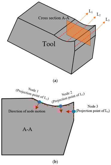 The crater wear occurs on the tool rake face. The nodal wear rate of each node on the wear surface is different, and the motion of each node needs to be analyzed separately. In this paper, the motion direction of the rake face node was simplified to be perpendicular to the initial rake face, as shown in Figure 3.