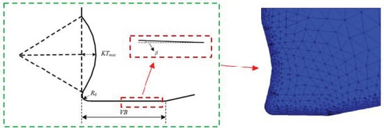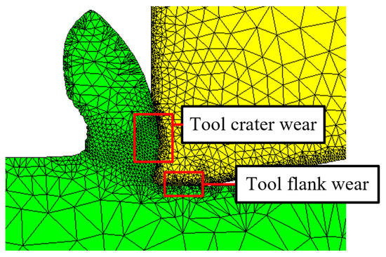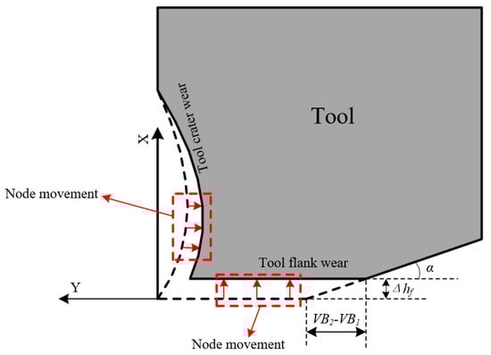 It is observed in Figure 3 that the tool tip position constantly changes during tool wear. The change in the tool tip position affects the tool–chip contact behavior; therefore, the influence of tool tip position change cannot be ignored in the tool wear prediction. The tool flank wear caused the tool tip moving up in the X-axis direction. When the cutting time is , the nodes less than from the tool tip on the tool crater wear surface can be regarded as the part removed by the tool flank wear, as shown in Figure 9.