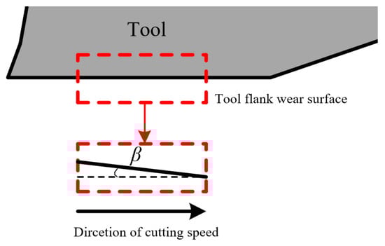 where is the tool relief angle, is the tool flank rolling angle at cutting time , and tool flank rolling angle means the angle between the tool flank wear surface and cutting speed, as shown in Figure 5. The tool flank wear rate model was obtained via the differential operation of Equation (3).