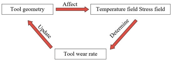 Tool wear is a real-time evolution process. In the process of tool wear, the tool geometry is constantly updated, and the temperature field and stress field of the tool wear surface are constantly changed. The temperature field and stress field determine the tool wear rate and further determine the tool geometry. Therefore, a positive feedback relationship exists between the tool geometry and the predicted tool wear rate. Figure 6 describes the positive feedback relationship.