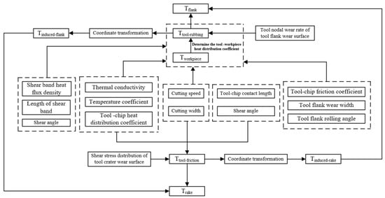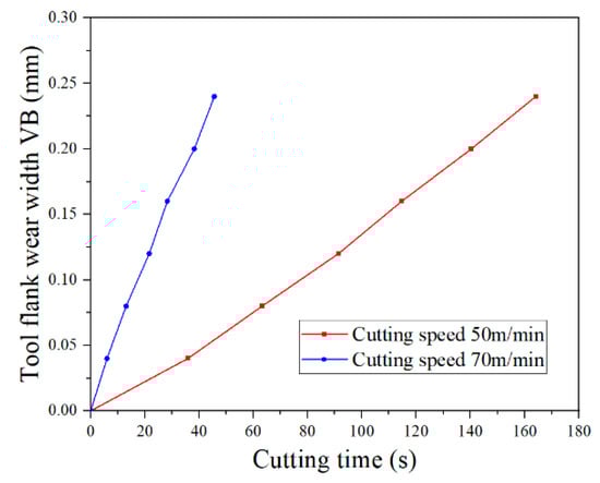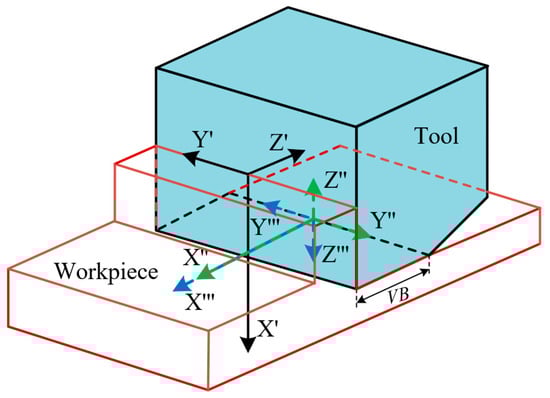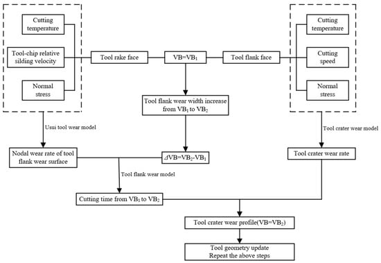 Firstly, the distributions of the cutting temperature, normal stress and tool–chip relative sliding velocity on the tool crater wear surface and tool flank wear surface were solved through theoretical modeling when VB = VB1. The tool crater wear rate was calculated via Equation (2), and the nodal wear rate of tool flank wear surface () was calculated via the Usui tool wear rate model. Secondly, the cutting time () of tool flank wear width increasing from VB1 to VB2 was calculated via Equation (5).