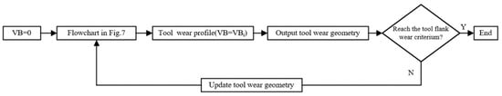 The tool wear prediction method can be extended to the whole tool wear process, as shown in Figure 8. The tool wear process can be divided into several tool wear stages: taking the fresh tool as the initial state (the fresh tool can be regarded as a special worn tool with VB = 0), the tool wear geometry of the first wear state can be obtained by using the flowchart shown in Figure 7, and the tool wear profiles at different wear state can be further obtained via stepwise iteration of the flowchart shown in Figure 7 until the tool reaches blunting standards. Finally, the tool wear prediction can be achieved.