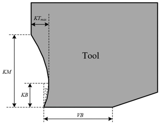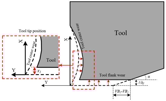 Finally, the tool crater wear profile when VB = VB2 was obtained, and the tool geometry was updated. The tool crater wear rate and tool flank wear rate can also be solved when VB = VB2, and the steps in Figure 7 can be repeated to calculate the time required to reach the next wear state. Then, the tool wear profile of the next wear state can be obtained.