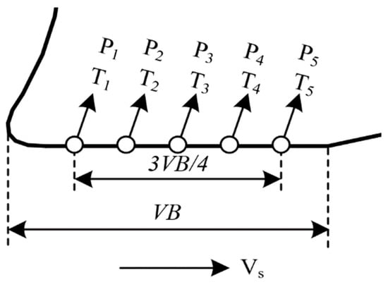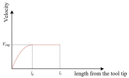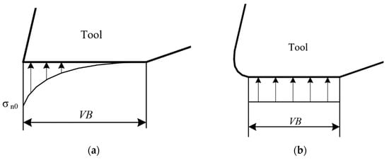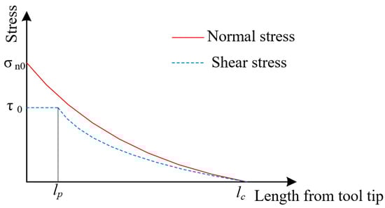 The distribution of normal stress and shear stress on the tool crater wear surface is shown in Figure 11 as Zorev’s model []. In Figure 11, is the length of tool–chip contact zone, and is the length of the sticking zone on the tool crater wear surface.