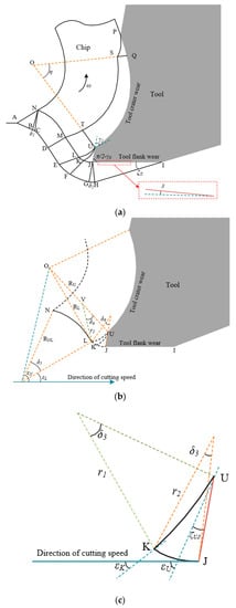 In Figure 12 and Equations (16)–(24), ζJI and ζUJ are the friction angles of the tool flank wear surface BUE; and are the fan-zone angles under points N and J; , , and are the slip line angles of UK, UL, NL and LJ; , , , , and are the angles of points J, L, K, N and U with respect to the cutting direction; and are the radius values of slip lines UK and KJ; is the velocity jump across the slip line NL; and and are hydrostatic stress of points N and U. The hydrostatic stress of point U can be regarded as being equal to the normal stress at the tool tip, as shown in Equation (25).