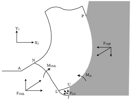 The force in the main shear zone of the worn tool is balanced with the force + in the tool–chip contact zone. The forces and + were decomposed into two directions of the X1 axis and Y1 axis. The X1 axis is parallel to the cutting direction. The torque in the main shear zone is balanced with the torque + + in the tool–chip contact zone. The reference point of the torque is point L. Equilibrium equations are listed according to Figure 13. The calculations of forces and momentum are listed in reference [].