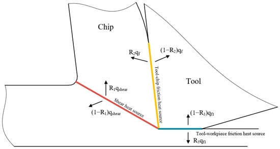 In Equation (32), is the environment temperature, and = 20 ; W is the cutting width; Λm is the thermal conductivity of workpiece material; is the shear band heat distribution coefficient; and is the shear band heat flux density. The calculations of and are shown in Equations (33) and (34).