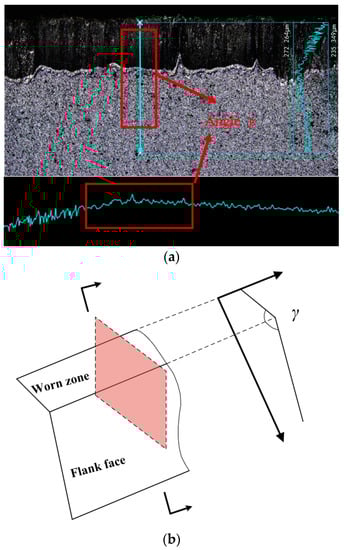 The tool flank rolling angle is the angle between the tool flank wear surface and the cutting speed, as shown in Figure 5. Malakizadi et al. [] found the existence of the tool flank rolling angle in the experimental results of machining Inconel 718. Nooraie [] found the tool flank rolling decreases with the increase in cutting time. At present, there is a lack of a prediction model for the tool flank rolling angle. In this paper, the tool flank rolling angle was measured by conducting an orthogonal cutting experiment.
