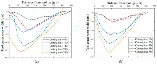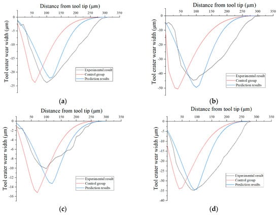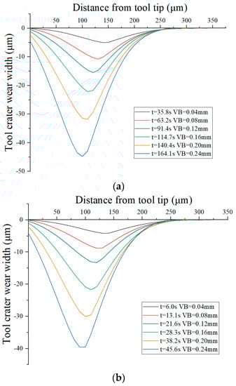 It can be observed from Figure 36 that the width of the tool crater wear profile decreases continuously with the increase in tool wear, and the deepest point of the tool crater wear profile is close to the tool tip. The evolution trend of the tool crater wear is consistent with the experimental results.