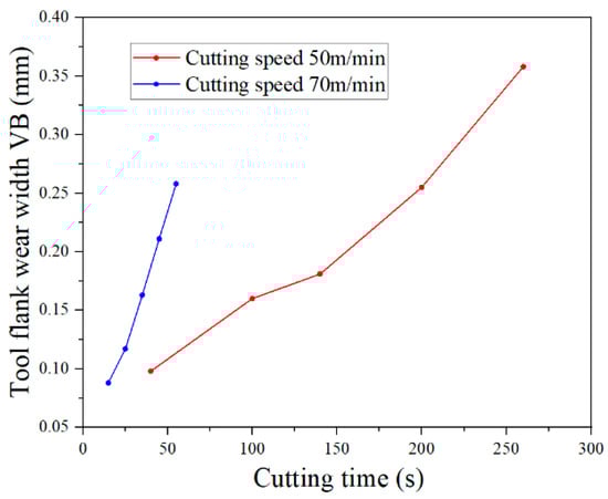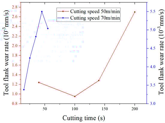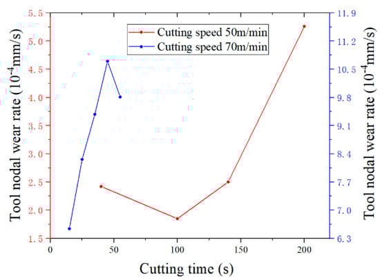 The maximum nodal wear rate of the tool crater wear surface increases continuously during the tool wear process. However, when the cutting speed is 50 m/min, the maximum value of the nodal wear rate of the tool crater wear surface is in a state of uniform rise. When the cutting speed is 70 m/min, the maximum value of the nodal wear rate of the tool crater wear surface rises sharply in the cutting time range of 13.1–21.6 s. It can be observed from Figure 39 that the maximum cutting temperature of the tool crater wear surface increases with the increase in tool wear, and its growth trend is the same as that of the maximum nodal wear rate. When the cutting speed is 50 m/min, the cutting temperature of the tool crater wear surface increases continuously. When the cutting speed is 70 m/min, the cutting temperature of the tool crater wear surface rises sharply in the range of 13.1–21.6 s, which is the same as the evolution trend of the nodal wear rate. The evolution of the cutting temperature caused by tool wear is the decisive factor for the increase in the nodal wear rate. In the tool wear process, the deepening of the tool crater wear profile increases the tool rake angle, which leads to the increase in the tool–chip relative sliding velocity, as shown in Table 8 and Table 9. The increase in the tool–chip relative sliding velocity increases the cutting temperature of the tool crater wear surface.
