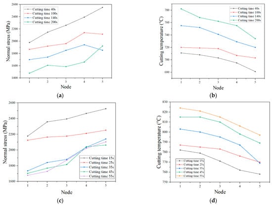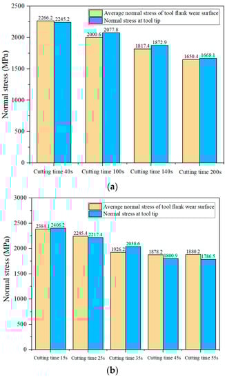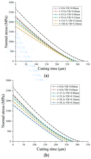 The normal stress of the tool–chip contact zone is exponentially distributed. The normal stress in the sticking zone is larger than that in the tool–chip relative sliding zone, as shown in Figure 40. The normal stress distribution caused the nodal wear rate to be approximately symmetrical to the highest cutting temperature as the symmetry axis. The normal stress decreases slowly with the increase in tool wear, and the influence on the tool wear rate is weak.