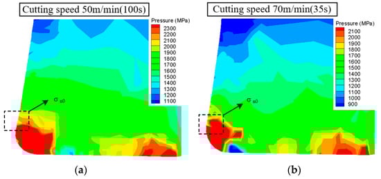 Distribution of normal stress on tool crater wear surface. (a) Cutting speed of 50 m/min and feed rate of 0.1 mm/r. (b) Cutting speed of 70 m/min and feed rate of 0.1 mm/r.