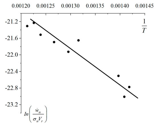 The cutting speed, nodal wear rate, cutting temperature and normal stress were substituted into Equation (4). The scatter plot between and was obtained, and the scatter plot was linearly fitted, as shown in Figure 35.