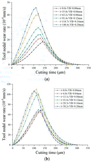 By analyzing the distribution of the cutting temperature, normal stress and tool–chip relative sliding velocity on the tool wear surface, the distribution of the nodal wear rate on the tool wear surface was obtained, and the evolution of the tool wear rate during the machining process was revealed.