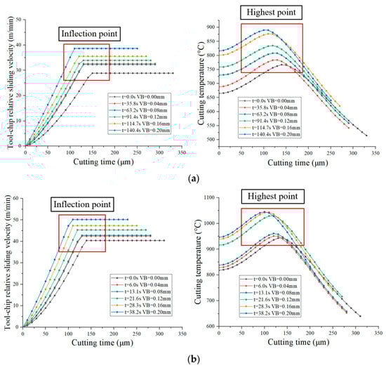 Distribution of tool–chip relative sliding velocity and cutting temperature on tool crater wear surface. (a) Cutting speed of 50 m/min and feed rate of 0.1 mm/r. (b) Cutting speed of 70 m/min and feed rate of 0.1 mm/r.