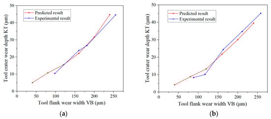 Prediction results of tool crater wear. (a) Cutting speed of 50 m/min and feed rate of 0.1 mm/r. (b) Cutting speed 70 m/min and feed rate 0.1 mm/r.
