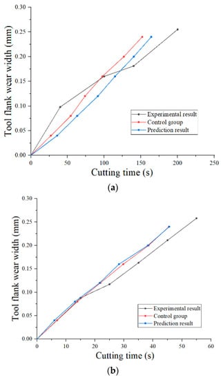 Results of tool flank wear prediction. (a) Cutting speed of 50 m/min and feed rate of 0.1 mm/r. (b) Cutting speed of 70 m/min and feed rate of 0.1 mm/r.