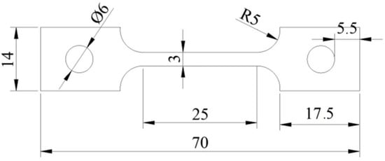 The raw materials of the unaged and aged samples were all obtained from hot-rolled plates. The mill model was a YZ-2310 two-high mill. The roll diameter of the mill was 310 mm, the maximum bite amount of the roll was 30 mm, and the rolling speed was 15 RPM, respectively. Three kinds of samples were assessed in this experiment. Two rough samples were solution treated at 990 °C for 1 h and then cooled in the air. Subsequently, they were aged at 700 °C and 800 °C for 4 h separately, followed by air cooling (AC). Another sample was left unaged. The geometric size of the tensile sample at room temperature is shown in Figure 1. The tensile specimens with the size of 20 × 30 mm (parallel to RD) and gauage length (L0) of 25 mm were assessed on a DDL50 universal testing machine along the TD direction with the strain rate of 5 × 10−4s−1 at room temperature.