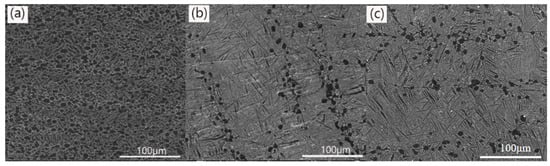 SEM image of the alloy sheet: (a) rolled, (b) aged at 700 °C for 4 h, (c) aged at 800 °C for 4 h.