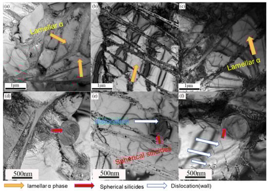 As the aging temperature rises to 800 °C, the content and size of the equiaxed α phase negligibly changed. Compared with the alloy aged at 700 °C/4 h, the contribution of the equiaxed α phase was deemed to be little. As shown in Figure 13d, a high-density dislocation wall was formed between the lamellar phases, resulting in the production of a clear dislocation strengthening effect. Figure 13e shows that no significant changes were observed in the shape or size of the silicide. From Figure 13f, high-density dislocations accumulated in the αp, which can markedly strengthen the matrix as a result. Combined with Table 1, the most obvious change observed after the aging temperature rose was the decrease in strength, especially in the yield strength, which decreased by 80 MPa on average. This was mainly because the yield strength, i.e., the dislocation overcomes the stress required by the surrounding Coriolis air mass. As the temperature increases, the nailing effect of the Coriolis air mass on the dislocation is weakened, and the force required for dislocation slip is subsequently reduced, which is represented by the reduction in the yield strength on a macro level. In addition, the α2 phase was also observed within the matrix of the alloy aged at 800 °C/4 h, as shown in Figure 8. The size of the nanoscale precipitated phase did not change much, but the distribution state became more dispersed. As a result, the motion of dislocation was hindered by the dispersed precipitated particles, signifying that the strength of the alloy will be significantly improved. Previous studies have stated that the dispersion of the α2 phase with a fine size distribution contributes to the strengthening of the alloy [34].