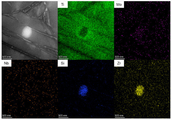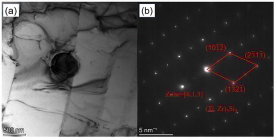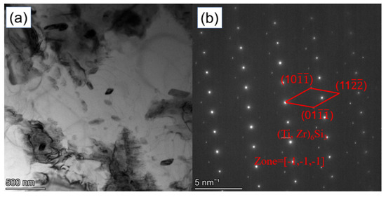 From Figure 4d–f, it can be seen that large-scale phase particles are generated during the rolling and aging processes. Combined with the EDS diagram in Figure 5, it can be clearly seen that silicon is enriched in the particles, and thus it can be preliminarily judged as silicide. After the selected area electron diffraction (SAED) spot calibration, its structure can be determined as the (Ti, Zr)5Si3 phase with a densely packed hexagonal structure, and the size of this phase is 0.3–1.2 μm [22,23]. Most of these silicides are distributed between the α lamellar phase boundaries, while a minor part is distributed at the boundary edge of the equiaxial α phase. The SAED pattern of the spherical silicide is shown in Figure 6b. After aging at different temperatures, the morphology of the spherical silicide has no obvious change, but the size increases from 700 nm to 800 nm, respectively, with the increase of temperature. Figure 7 shows another silicide in the alloy, which is fusiform in shape, with a length-to-diameter ratio of 2.8 and a size of 100–200 nm, respectively. The crystal structure was subsequently identified as the (Ti, Zr)6Si3 [24] phase after SAED diffraction spot calibration.