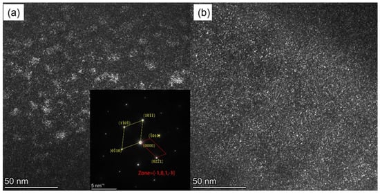 Additionally, the superlattice spots imply that the Ti3Al-ordered phase encompassing a HCP structure precipitates in the HCP titanium matrix [25,26]. By comparing the characteristics of Ti3Al(α2) phase aged at different temperatures, as shown in Figure 8, in the alloy aged at 700 °C, the size of the second phase Ti3Al is too small to be counted, and the Ti3Al particles show a state of aggregation. When aging temperature rose to 800 °C, the size of the Ti3Al(α2) phase particles negligibly changed, and the originally aggregated particles became more dispersed. Therefore, with the increase in the aging temperature, the size of the Ti3Al(α2) phase increases and the particles become relatively dispersed as a result.