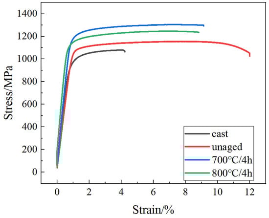 Figure 9 displays the mechanical properties of Cast-A, R-A, 700-A, and 800-A at RT, respectively, along with a set of experimental data, including the corresponding values of the tensile property parameters, ultimate tensile strength (UTS), yield strength (YS), and elongation (EL) are summarized in Table 1. The tensile strength (UTS) of the alloy was increased from 1156 MPa to 1304 Mpa, respectively, when comparing the curves of the unaged and 700 °C/4 h aging. When the aging temperature increased, the tensile strength (UTS) of the alloy sheet decreased to about 50 MPa. On the other hand, when examining the alloy from R-A to 700-A, elongation decreased from 12.0% to 9.1%, respectively. With further increases in the temperature, only little changes in elongation were observed.