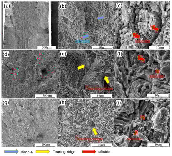 Tensile fracture morphology: (a–c) unaged; (d–f) aged at 700 °C for 4 h; and (g–i) aged at 800 °C for 4 h.