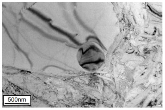 The interaction mechanism between these precipitates and dislocations was analyzed and explained through characterizing the samples using SEM, TEM, and the tensile test. Two kinds of silicide have been defined in the previous article [28,29]. The structure of these two silicides is a hexagonal structure. The chemical formula of large-size silicides is (Ti,Zr)5Si3 (a = 0.7429, c = 0.5139), and the size ranges from 0.3~1.2 μm, respectively. The chemical formula of the small-size silicide is (Ti,Zr)6Si3 (a = 0.7010, c = 0.3680), and the size ranges from 100 nm to 200 nm, respectively. The precipitation state of the silicide will have a certain effect on the strengthening of the alloy. The strengthening mechanism of the alloy needs to be analyzed in the three stages of alloy rolling, 700 °C aging, and 800 °C aging, respectively. The first is the rolling stage, Due to the rolling temperature of 980 °C, which is close to the β transition point, the equiaxed α content can effectively controlled at about 25% after forging near β [30], meaning that the alloy can obtain a better match of strength, plasticity, and toughness than the casting state. According to Table 1, the reason for the obvious improvement in the strength and plasticity of the alloy after rolling is the change of the Weissmann microstructure to a bimodal microstructure. Figure 12 shows that large-size silicides were found between αp and αs. Additionally, no obvious nailing effects on the silicide and dislocation entanglement were found in the microstructure of the rolled alloy.