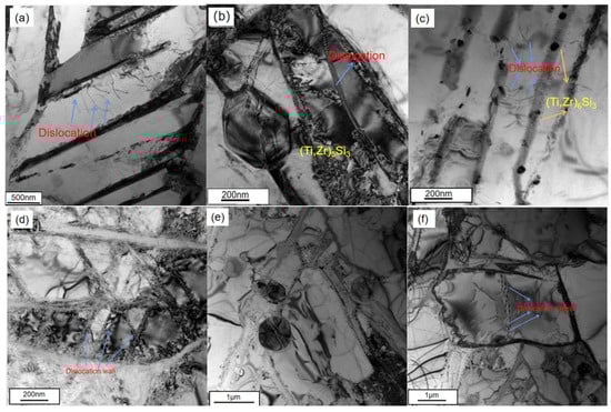 Entanglement effect of dislocations in alloys (a–c) 700 °C/4 h; (d–f) 800 °C/4 h; (a) lamellar alpha; (b) (Ti,Zr)5Si3; (c) (Ti,Zr)6Si3; (d) lamellar alpha; (e) (Ti,Zr)5Si3 (f) dislocation primary alpha.