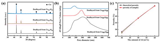 - By chemically dealloying Cu60Al40, Cu50Al50 and Cu40Al60 alloys in 10 wt.% H2SO4 solution at a temperature of 90 °C, bulk nanoporous copper (Փ15 × 2 mm) with consistent pore morphology was successfully produced. The pore structure increased from 204.35 nm to 309.06 nm, when the porosity increased from 47.48% to 67.69%.
